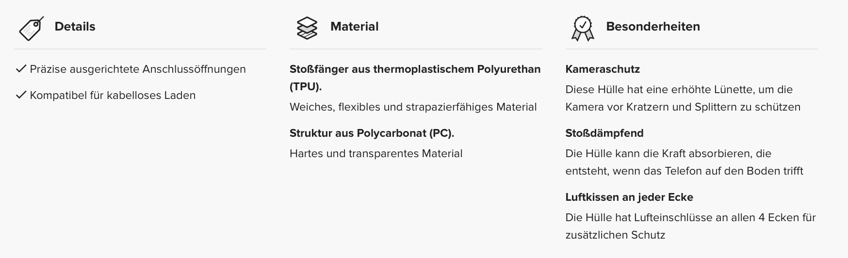 Diese Hülle sieht schick aus, ist aber sehr robust. Ihre solide Konstruktion passt perfekt zu deinem Telefon und schützt vor Kratzern, Staub, Öl und Schmutz. Dank der glatten Oberfläche liegt sie zudem gut in der Hand.